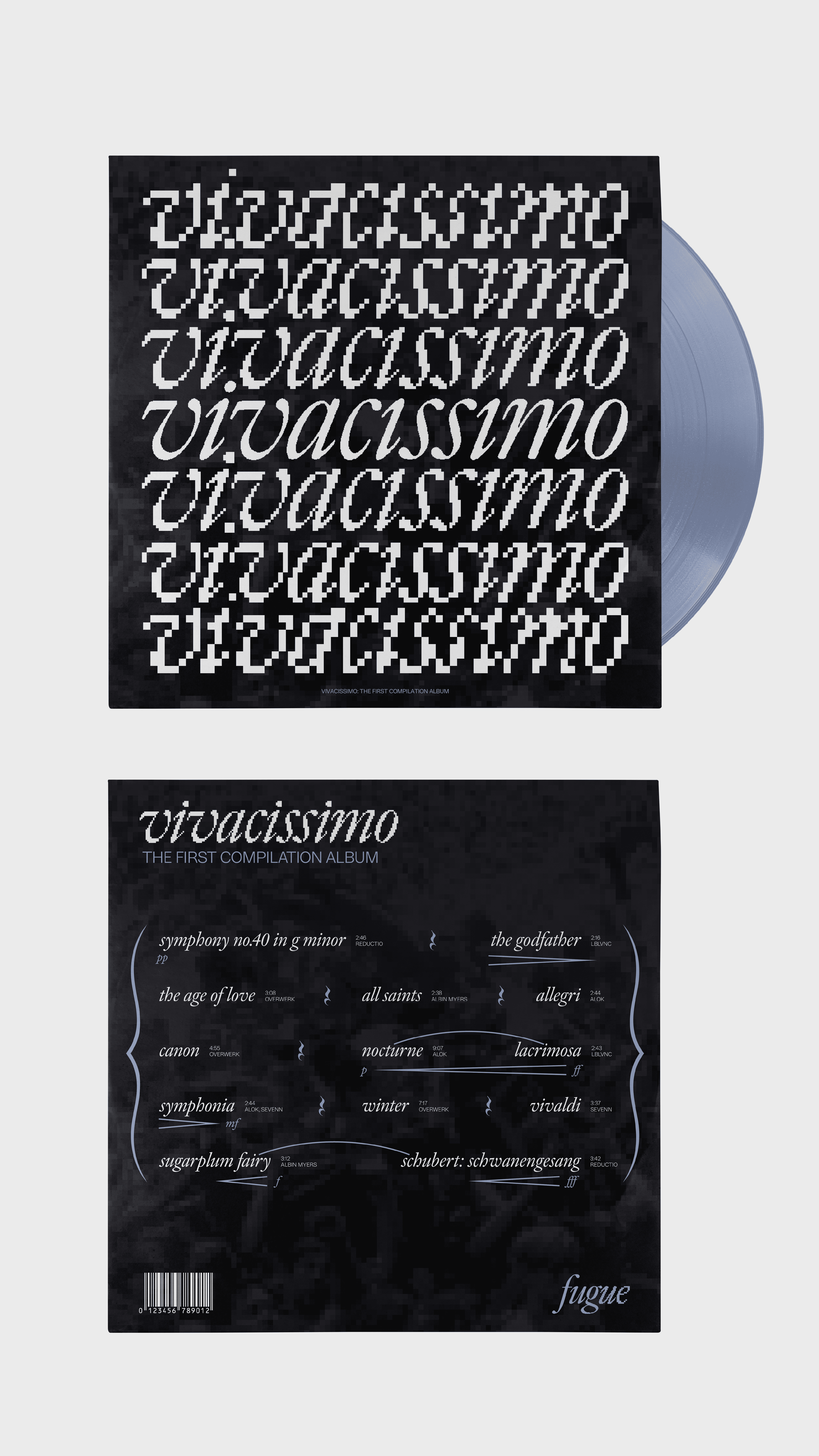 Fugue is a record label that represents a unique subgenre of EDM– techno remixes of classical pieces. I used these two distinct aesthetics to inform the brand visuals.