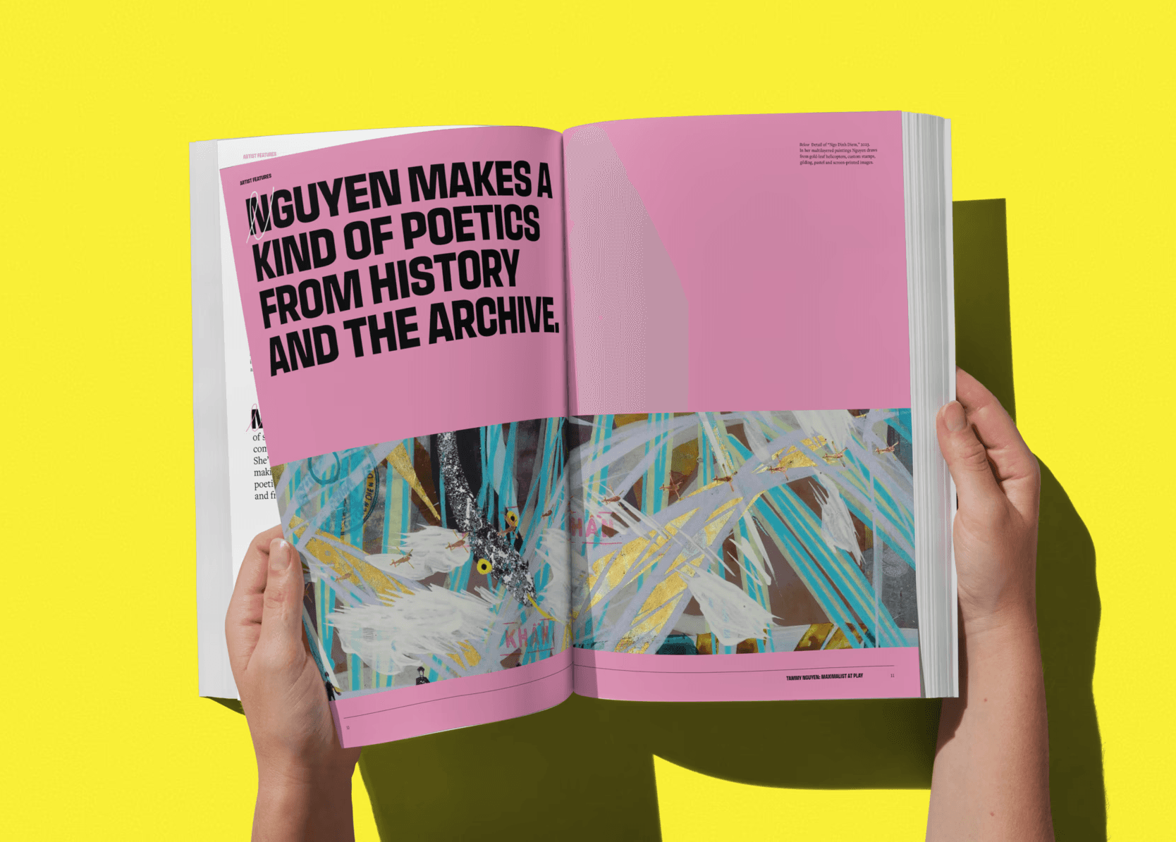 For the editorial piece, I was intrigued by the layered nature of Tammy Nguyen's work in physical and conceptual terms. I layered thin script type over bold letters, as her work often features thin lines layered over thicker, bolder areas of color.